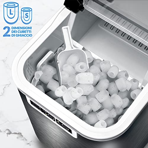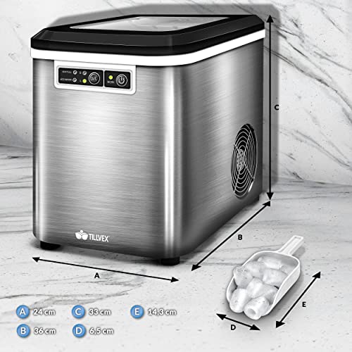 Tillvex Macchina per Ghiaccio 12 kg - 24 h | da Casa in Acciaio Inossidabile | Professionale | 2,2 L Serbatoio d'Acqua | Display LED, Autopulizia | 2 Misure di Cubetti
