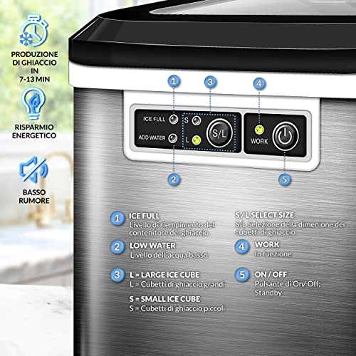 MOLTE FUNZIONI: Funzione timer, indicatore del livello del ghiaccio e dell'acqua, pratica modalità di risparmio energetico, vassoio per cubetti di ghiaccio da 0,8 litri, funzione di allarme quando lo scomparto del ghiaccio è pieno, spie luminose e display LED.