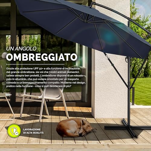 UN'OMBREGGIATURA IDEALE: Grande ombrellone con Ø 3 m per ombreggiare vaste aree. Il tessuto dell'ombrellone è in poliestere da 180 g/m² e offre una protezione dai raggi UV fino a UPF 50+. In questo modo, l'ombrellone da giardino trattiene l'98 % dei raggi UV.