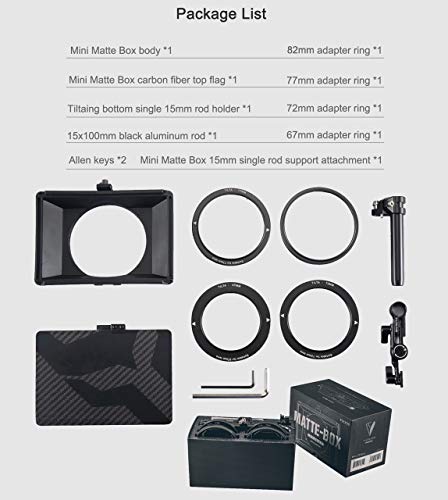Il kit comprende la Mini Matte Box, la bandiera francese superiore, l'attacco per supporto asta singola da 15 mm e quattro anelli adattatori per obiettivo (82 mm, 77 mm, 67 mm e 72 mm). Gli anelli adattatori aggiuntivi nelle dimensioni non standard (52 mm, 55 mm, 58 mm, 62 mm, 85 mm) devono essere acquistati separatamente.