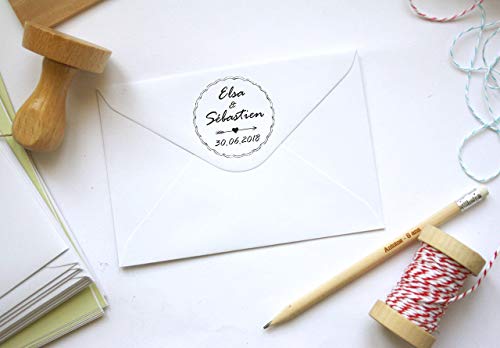 Timbro matrimonio personalizzato boemia, floreale, con nomi e data, forma rotonda 5 cm