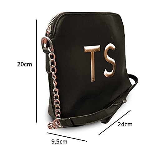 Timeshop Lab Borsa Creta a tracolla media Nera da donna sintetica in ecopelle liscia con cerniera tasca esterna e personalizzata con iniziali in lettere di metallo dorate (Con Iniziali)