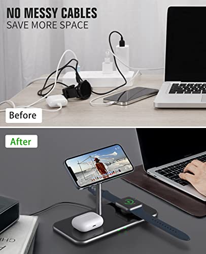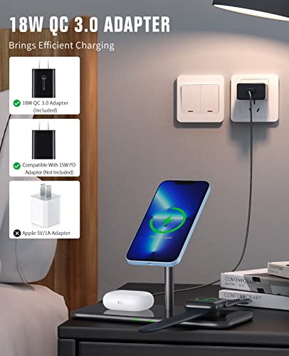 TiMOVO 3 in 1 caricatore senza fili, stazione di ricarica magnetica rapida Mag-Safe 15 W con QC3.0 adattatore compatibile con iPhone 12/13/14/Pro/Max/Mini, AirPods 2/3/Pro, iWatch2/3/4/5/6/7, nero