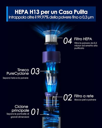 Il sensore intelligente Tineco iLoopTM fornisce un'aspirazione precisa: l'aspirapolvere fornisce una potenza di aspirazione precisa in base alla polvere rilevata, migliorando l'efficienza della pulizia;