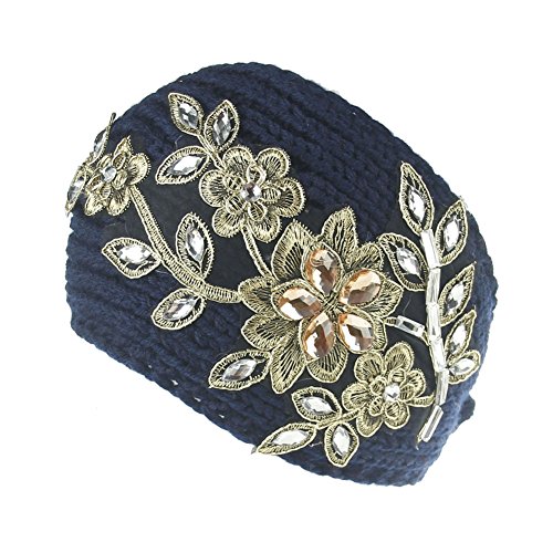 TINNINA - Fascia larga da donna lavorata a maglia, fatta a mano, all'uncinetto, con fiore di cristallo (blu navy)