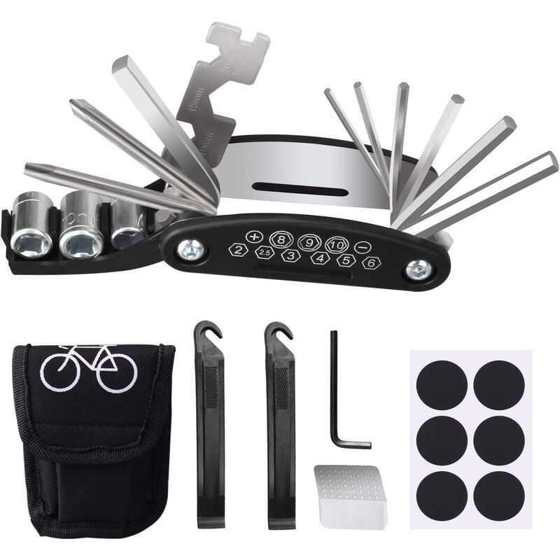 Kit di riparazione 16 in 1 - - Chiave esagonale a bussola 8/9/10/mm, cacciavite piatto, cacciavite Phillips, asta di prolunga presa, chiave solida 8/10/15/mm, chiave esagonale 2/2.5/3/4/5/6 mm, ruota a raggi.facile da rimuovere e installare, facile da montare e smontare senza attrezzi. 【Completamente aggiornato in termini di qualità】È realizzato in acciaio inossidabile di alta qualità e accessori funzionali perfetti durevoli, più resistenti ed efficienti. Questo strumento multifunzione per bici è portatile, leggero e l'accessorio perfetto per le riparazioni generiche della bici. 【Facile da trasportare e conveniente】Progettato per essere pieghevole e viene fornito con una borsa per il trasporto, tutti gli strumenti e gli accessori possono essere riposti al suo interno, inclusi accessori e altri piccoli oggetti. il kit degli attrezzi può essere messo in tasca, facile da trasportare per attività all'aperto o in viaggio. 【ottima app】Adatto per riparare la maggior parte delle biciclette