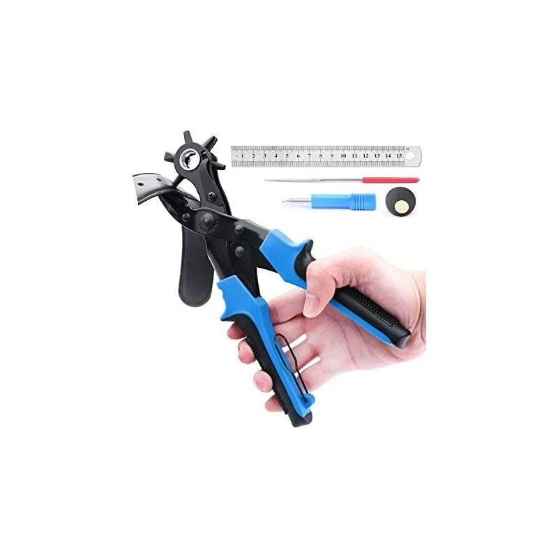 particolarmente utile come perforatore per cuoio. Il set perfetto clip per perforatore include perforatore per cuoio, 2 piastre di ricambio gratuite, cacciavite e righello. Il righello trasparente può misurare la tua parte con precisione e un cacciavite può sostituire le piastre di ricambio e girare le viti sulla cintura Alta qualità e sicurezza Le pinze da taglio resistenti sono realizzate in