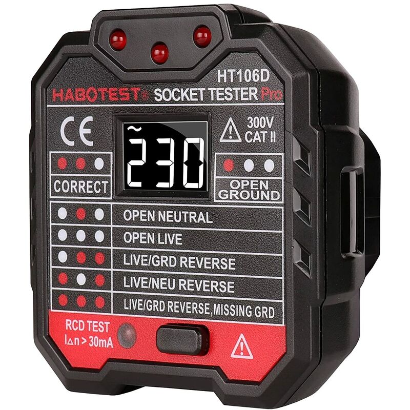 Tester per prese elettriche: tester per prese avanzato per rilevare rapidamente se la connessione del cavo della presa è corretta o meno. Puoi testare il sistema di protezione per garantire la sicurezza elettrica della casa. Perfetto per proteggere la tua sicurezza dal rischio di scosse elettriche. Display a LED luminoso: i modelli di luce sono ben etichettati sul retro del dispositivo. Gli indicatori LED rossi possono essere chiaramente illuminati anche alla luce diretta del sole. Il tester ha una luce incorporata quindi può essere utilizzato anche al buio, permettendoti di leggerlo rapidamente. Funzione DRC: questo tester elettrico testa i dispositivi RCD simulando la condizione di terra non collegata, che agisce sulle prese RCD e conferma il funzionamento del dispositivo di protezione di terra non collegato. Testa le prese standard cablate in parallelo alle prese RCD. Assicurati di utilizzare questa funzione su normali prese. Potrebbe far inciampare il cablaggio della casa. Design