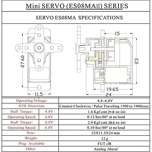 【Velocità Di Lavoro】 La velocità di lavoro dell'ingranaggio metallico del servo analogico è: 0.12sec/60°a 4.8V;