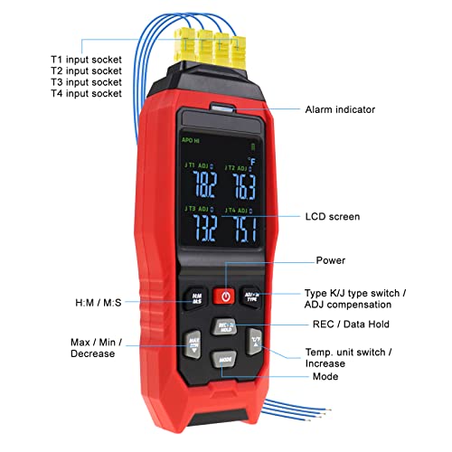 Alta precisione: il termometro a termocoppia del datalogger K/J offre un livello di precisione incredibilmente elevato Intervallo tipo K: -200~1372°C (-328~2501°F) e tipo J: -200~1200°C (-328~ 2192°F), garantendo un monitoraggio preciso della temperatura per tutte le vostre esigenze.