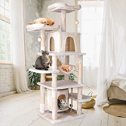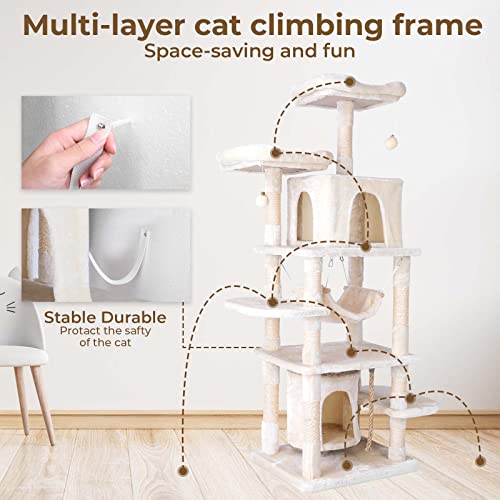 Tiragraffi grande 170 cm, albero per gatti con albero da arrampicata stabile, albero per gatti con amaca, tiragraffi per attività, albero da arrampicata, cesto, amaca, pompon, per gatti grandi, beige