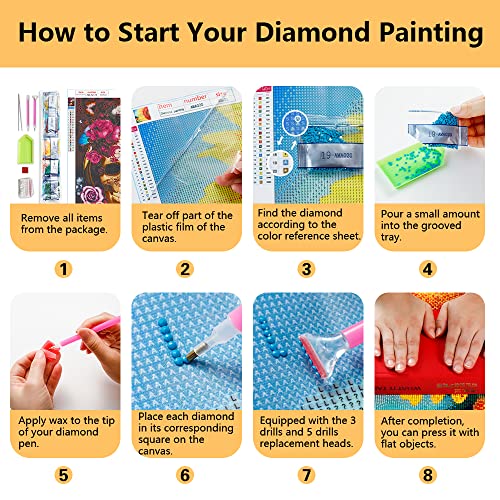 Tela di alta qualità: l'arte con diamanti 5D utilizza tela stampata ad alta trasparenza, con consistenza uniforme, motivi ad alta definizione, impermeabile, ecologica, non facile da piegare e non sbiadisce. L'adesivo a caldo ecologico è molto forte e non cade facilmente. La pittura completa con diamanti può essere conservata per almeno 20 anni.