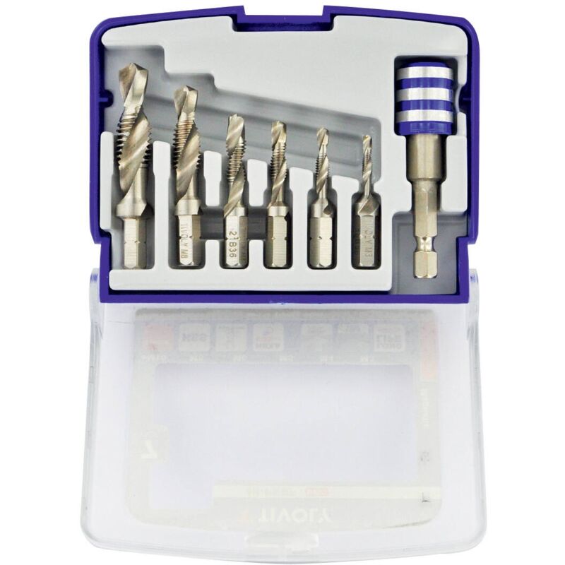 7 pezzi con 6 punte, maschi, frese HSS impugnatura esagonale da M3 a M10 - Portapunte a cambio rapido > Utensile 3 in 1, utensile per forare, maschiare e sbavare in un unico passaggio. Applicazione su acciaio con l'ausilio dell'avvitatore o del portainserti Realizzato in acciaio HSS, che consente una maggiore durata
