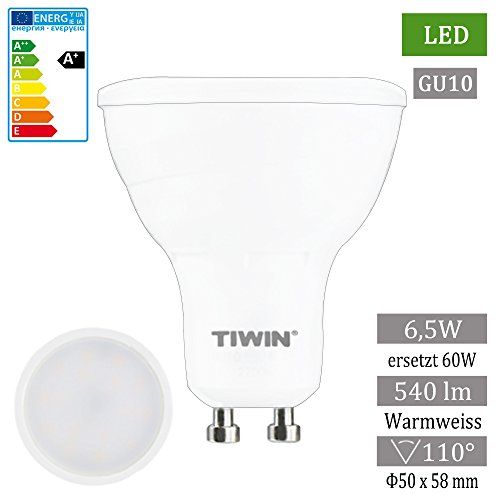 TIWIN 5er Sparset NUOVO 6.5W GU10 lampadina a LED lampada del riflettore BIANCO CALDO A + / sostituiti circa 60 Watt / 540 lumen / 2700K / Angolo: 110 gradi/SMD 2835 Spotlight