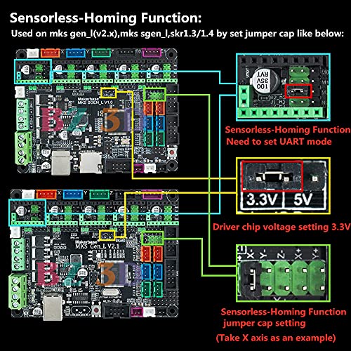 Supporta la modalità UART È possibile utilizzare la modalità UART in MKS SGEN L V1.0 / MKS GEN L V2.0 / MKS Robin E3D, SKR 1.3 / 1.4 impostando il ponticello. (Non è necessario alcun ponticello, non è necessaria alcuna unità di saldatura ed è più comodo da usare) Questa funzione non supporta MKS GEN L V1.0