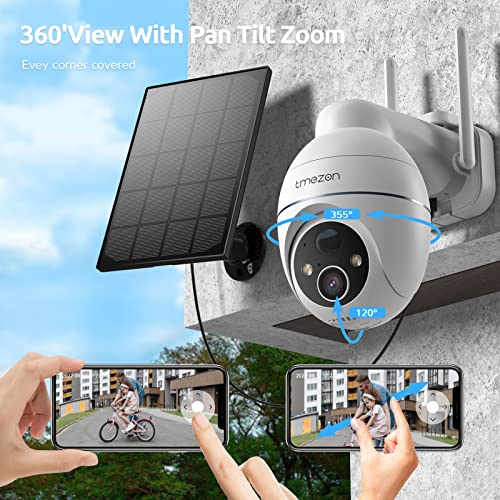 TMEZON Telecamera Wi-Fi Esterno Senza Fili con pannello solare, 2K PTZ Videocamera Sorveglianza Telecamera Wifi Batteria,Visione Notturna a Colori,Rilevazione di Movimento PIR,Sirena, Audio a 2 vie