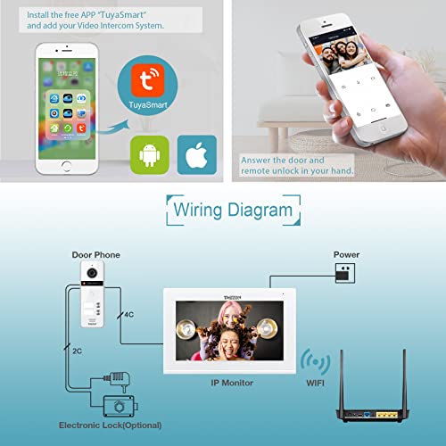 【Videocitofono WiFi Connessione all'APP TuyaSmart】Visita il monitor nel telefono, Goditi la vita intelligente. Usa la rete wifi 2.4Ghz per aggiungere il monitor all'APP mobile TuyaSmart, Quando qualcuno premerà il campanello, riceverai una notifica dall'app sul tuo smartphone. Fai clic su di esso, quindi puoi vedere e parlare con il visitatore, persino aprirgli la porta.