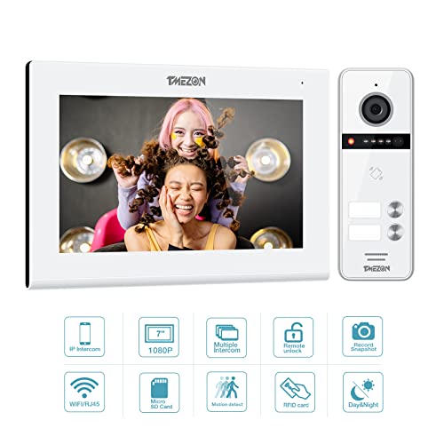 TMEZON Videocitofono WiFi Bifamiliare, 4 fili video citofono 1080P 7'' IP monitor touchscreen, Video doorbell Esterno Cablata Telecamera visione notturna,APP/Carta RFID Unlock,connessione wifi Tuya