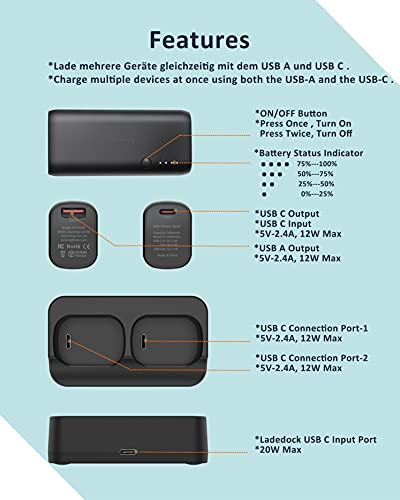 【Batteriekapazität】5000 mAh, 3,7 V, 18,5 W. 【USB-C】Ingresso/Uscita 12 W Max;