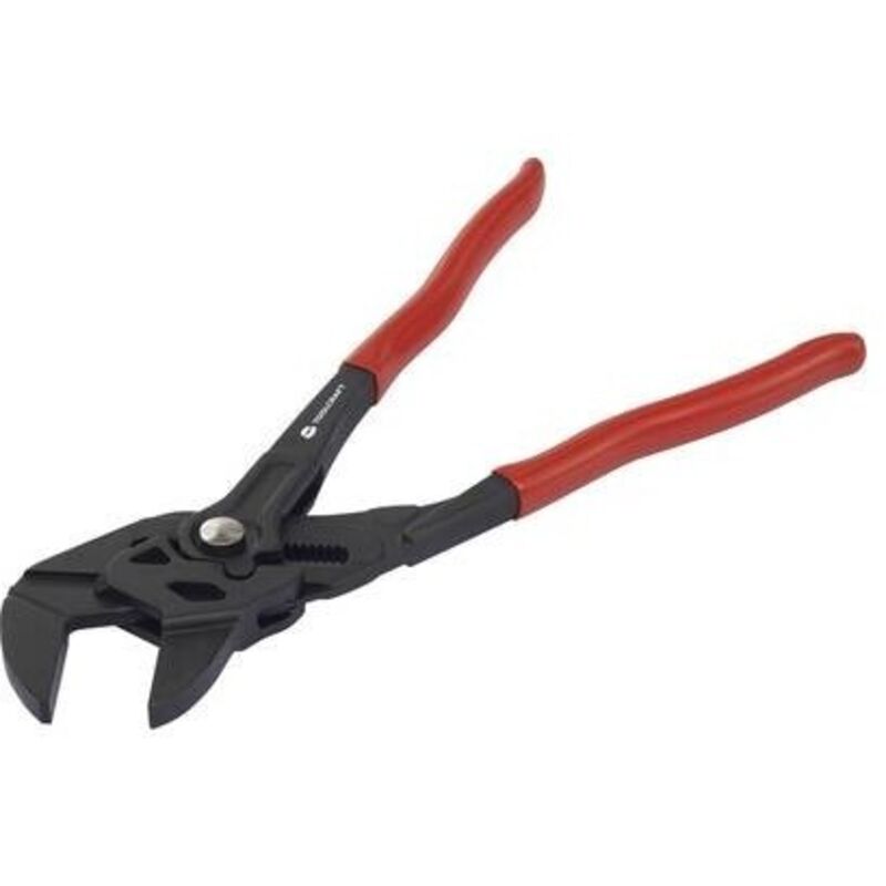Dettagli tecnici Dimensione chiave (metrica) 50 mm Dimensione del prodotto, lunghezza 250 mm Materiale Acciaio al carbonio, PVC Peso 542 g Proprietà del materiale fosfatato Tipo prodotto Pinza chiave combinata Apertura chiave: da 32 a 50 mm Pinza regolabile 250 mm Le ganasce lisce e parallele consentono un montaggio delicato di dadi e viti fino a 50 mm di larghezza della chiave. Punti di forza e dettagli Comoda regolazione di precisione con pulsante, apertura chiave: da 32 a 50 mm Rivestimento impugnatura antiscivolo Dispositivo di serraggio integrato Caratteristiche Lavorazione delicata di raccordi con finitura superficiale La corsa tra le superfici di presa permette di lavorare secondo il principio del cricchetto, senza che le pinze debbano essere tolte. Il comodo azionamento con un solo pulsante consente una semplice e rapida regolazione della pinza direttamente sul pezzo da lavorare. Acciaio al carbonio garantito per sopportare i carichi più elevati Forma della testa: testa