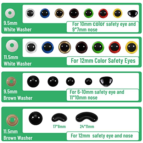 Quantita: L'articolo contiene 264 pezzi di occhielli di sicurezza in plastica, 100 pezzi di nasi di sicurezza triangolari, 26 pezzi naso arcuato, e 390 pezzi rondelle di 2 misure