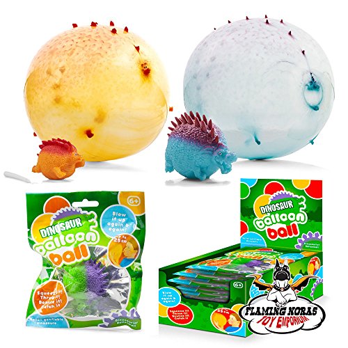 Palla gonfiabile a forma di dinosauro. Spingere la cannuccia nella base del dinosauro e poi soffiare nell'altra estremità per gonfiarla. Una volta gonfiato alla misura desiderata, rimuovere la cannuccia e la palla di dinosauro rimarrà di quelle dimensioni. Getta la palla, rimbalza e schiaccia il pallone pieno d'aria e manterrà le sue dimensioni e forma. Reinserire la cannuccia e l'aria lascerà di nuovo il pallone, sgonfiandolo pronto per la prossima volta. Disponibile in tre diversi modelli