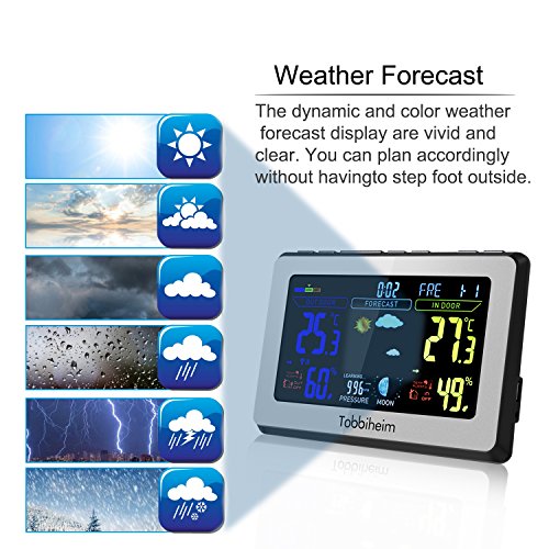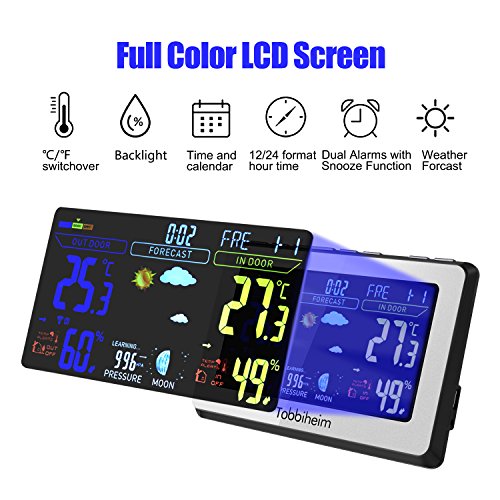 Tobbiheim, Stazione Meteo Radio, Stazione meteorologica, visualizzazione colore pieno, Termometro e igrometro per temperatura di interni ed esterni, umidità, fasi lunari, sveglia e ricarica USB per cellulare - argento
