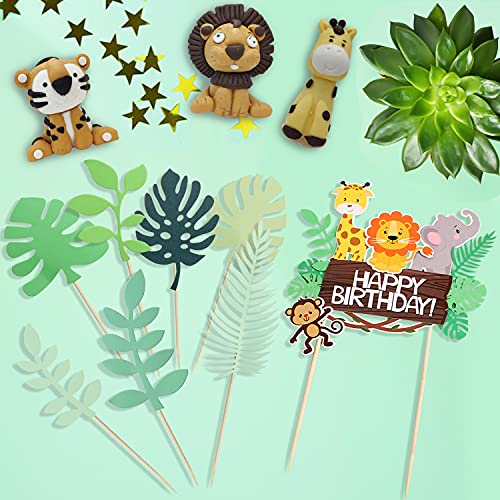 Pacchetto: 1 x topper per torta di buon compleanno, 7 x foglie topper per torte, 1 x leone di plastica, 1 x giraffa di plastica, 1 x tigre di plastica
