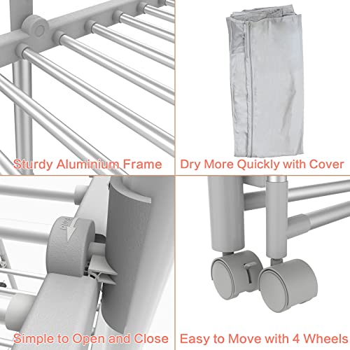 Todeco - Stendibiancheria Elettrico, Stendino Pieghevole da Interno - Dimensioni Piegato: 143 x 72 x 9 cm - Materiale: Lega di Alluminio - 3 Ripiani, Bianco, con Ruote e Coperchio