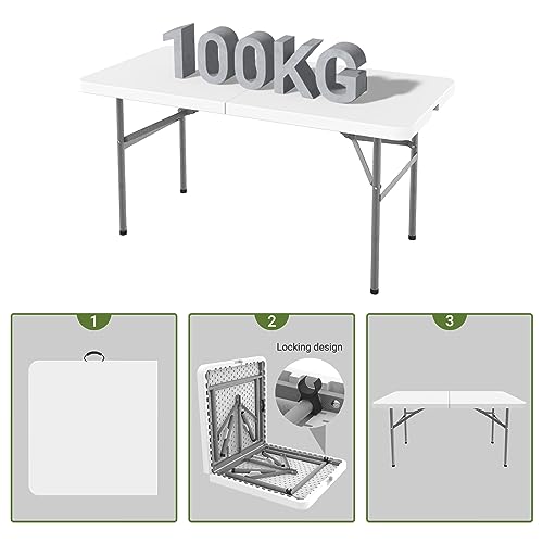 Todeco Tavolo Trasportabile, Tavolo Portatile Pieghevole, 124 x 61 cm, Bianco, Pieghevole a metà, Materiale: HDPE, Carico Massimo: 100 kg