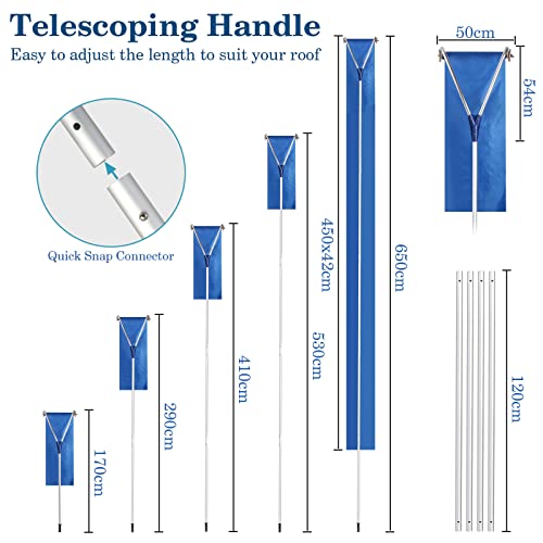 Materiale di qualità e leggero: il rastrello da neve è realizzato in lega di alluminio di qualità ma leggera con una buona resistenza all'usura, che riduce il peso. Lo scivolo retrattile in tessuto oxford può facilmente e fa scivolare la neve dal tetto per gravità.
