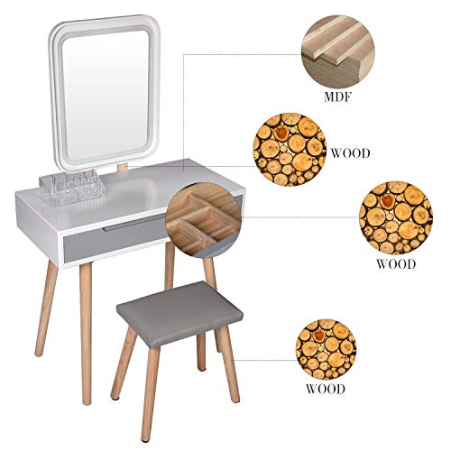 [Stabile e durevole]: Realizzato in MDF ambientale di grado P2, la toeletta e lo sgabello sono favolosamente robusti e resistono bene all'umidità, al calore, ai danni. La sedia è rivestita con cuscino in schiuma di poliestere al 100%, ed è spessa e larga.