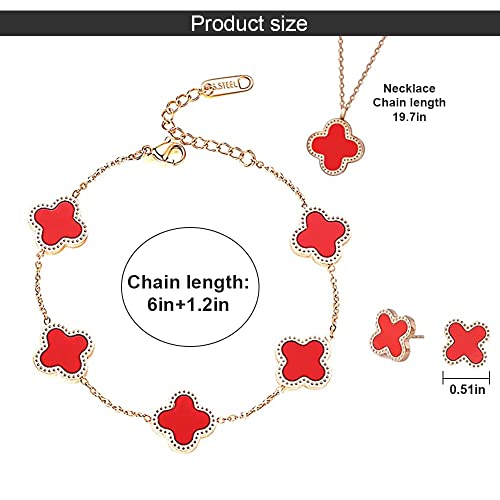 TOFBS Collana Quadrifoglio Parure Gioielli Fortunato Quadrifoglio 18K Placcato Oro Rosa Acciaio Inossidabile Doppia Faccia Rosso Nero Collana Orecchini Bracciali Set per Donna Ragazze (Rosso)