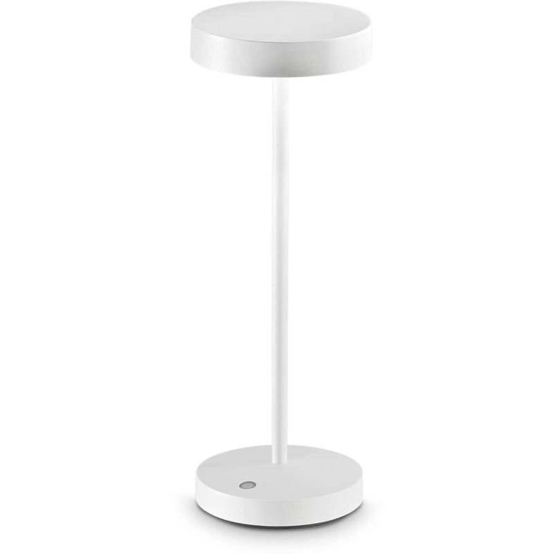 Lampada da tavolo a batteria. Base, stelo e paralume in metallo verniciato opaco. Diffusore in acrilico. Interruttore integrato sulla base. Finiture: bianco, nero. Tempo di ricarica della batteria 7 ore. Ø 120 x H 320 mm LED 2W 20000 h 3000 K 230 lumen IP54