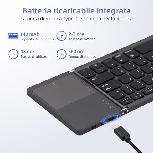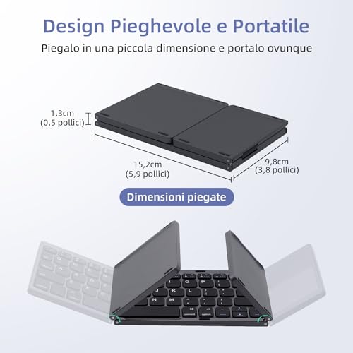 Compatto e portatile: la tastiera è pieghevole in una dimensione compatta di circa 15 x 9,7 x 1,3 cm, che la rende estremamente leggera e facile da trasportare. È ideale per viaggi di lavoro, viaggi ed esposizioni, offrendo praticità senza compromettere la funzionalità.