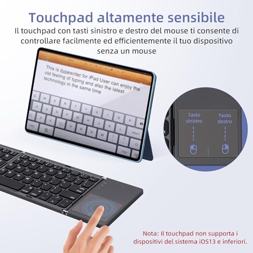 Touchpad migliorato: la tastiera è dotata di un innovativo touchpad con funzionalità sensibile alla pressione, che lo rende più simile al touchpad di un laptop. Supporta vari gesti, incluso il trascinamento dei file tramite un doppio tocco e tieni premuto. Il touchpad è compatibile con i dispositivi iOS (iOS13 e versioni successive).