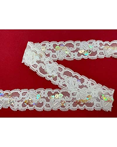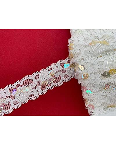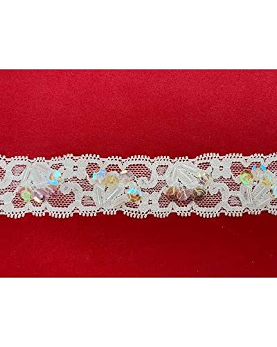 TOMASELLI MERCERIA Passamaneria Pizzo Elastico Tulle Tramezzo Bordo Ricamo Smerlato Tubetti Paillettes Sfaccettate Multicolor Alto 3 Cm - Bianco