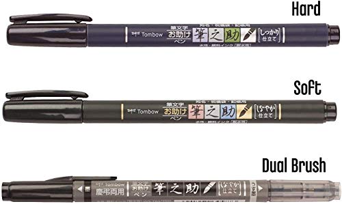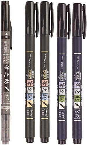 Tombow Fudenosuke Brush Pen 5 Pack (set per calligrafia Big) 2x punta dura + 2x punta morbida + Dual Brush Pen (nero + grigio)