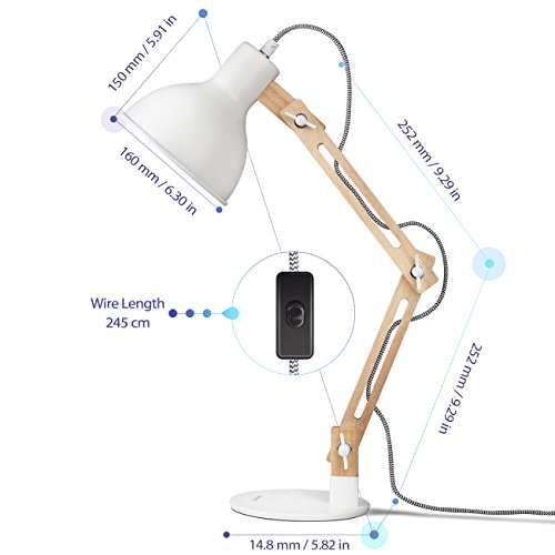 Tomons Lampada da Lettura Design Legno Classico, Lampada da Tavolo, Lampada Regolabile Scrivania, con Braccio Snodato, Eye-friendly, Bianco