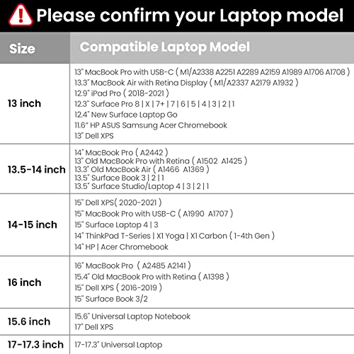 Adatta la maggior parte dei notebook portatili universali da 15,6": Acer Aspire, Dell New Latitude| Inspiron 15, HP ENVY| Spectre, Lenovo ThinkPad| IdeaPad, etc;Dimensioni massime del modello: inch 15,2 x 10,4 x 1,4 / cm 38.6 x 26,41 x 3.55.