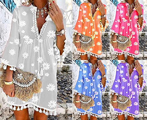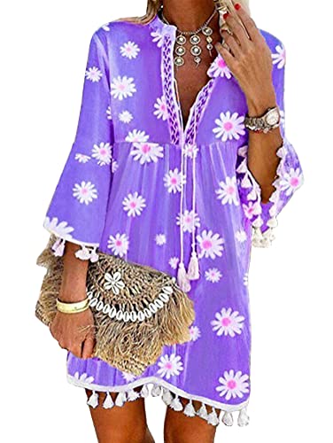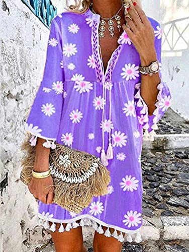 Tomwell Abito da Donna Boho Elegante Casual a Maniche Lunghe Estivo Scollo a V Mini Vestiti Boemia Vestito Donna Estivo Casual Vintage Allentato Tunica Abito Floreale Cocktail B Viola 3XL