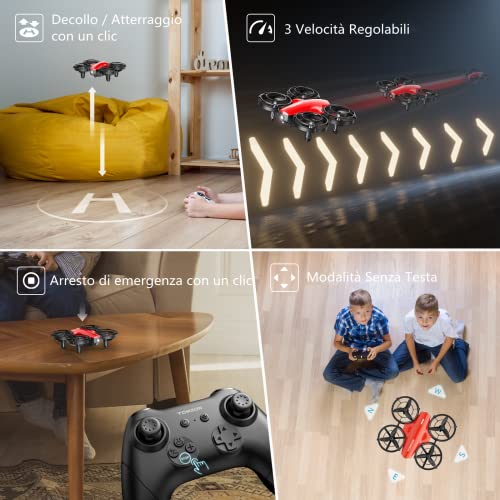 【Controllo Semplice di Drone Piccolo】quadricottero è molto facile da controllare, droni per bambino abbinerà automaticamente la frequenza dopo l'accensione, basta fare clic per calibrare per decollare, una varietà di funzioni operative con un solo tasto, come decollo, atterraggio, mantenimento dell'altitudine, arresto di emergenza, modalità headless, ecc, puoi ottenere un volo stabile grazie alla funzione di regolazione fine.
