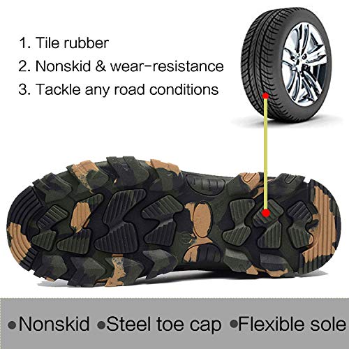 PUNCTURE-PROOF & STYLISH: con l'amore in mente, inseriamo la nostra più sincera attenzione nelle scarpe. Il puntale in acciaio e l'intersuola in acciaio proteggono i piedi dalle forature durante le scarpe in acciaio. Gli uomini hanno la tomaia in pizzo mimetico, mantengono lo stile attivo per quelli impegnato nella costruzione, nello sfruttamento, nella fucinatura o nella fabbricazione.