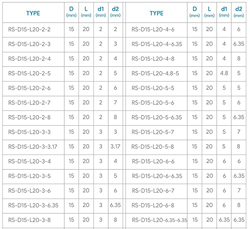 Ad esempio d1xd2 (mm): 2x2, 2x3, 2x4, 2x5, 2x6, 2x7, 2x8, 3x3, 3x3.17, 3x4, 3x5, 3x6, 3x6.35, 3x8, 3.17x4, 3.17 x5, 3.17x6, 3.17x8, 4x4, 4x5, 4x6, 4x6.35, 4x8, 5x5, 5x6, 5x6.35, 5x7, 5x8, 6x6, 6x6.35, 6x7, 6, 6. 8, 6. 35x6.35, 6.35x7, 6.35x8, 7x7, 7x8, 8x8