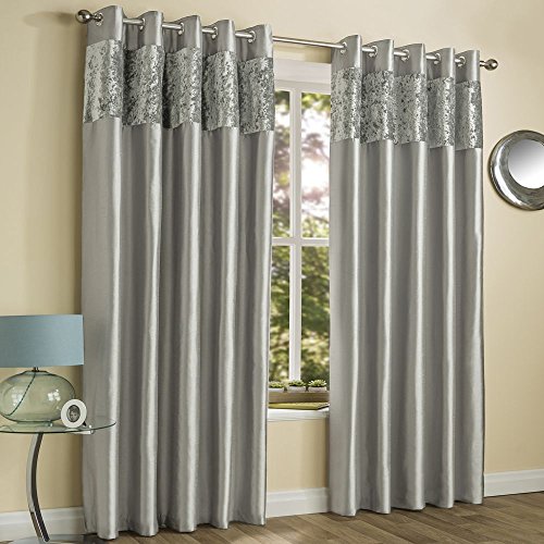 Elegante coppia di tende in finta seta con bordo in ciniglia. Disponibili separatamente copricuscini, cuscini e set copripiumino coordinati.