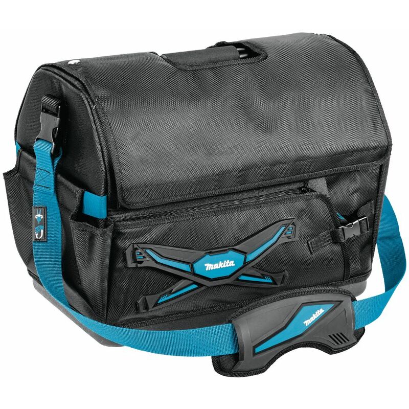 La borsa degli attrezzi ha nove scomparti esterni in diverse dimensioni, otto nastri elastici per utensili manuali e un ampio compartimento nel mezzo della borsa per macchine. Il pavimento è impermeabile e rinforzato. Con manico in metallo parzialmente imbottito. Compreso un cappuccio rimovibile e una cinghia dal sistema della cinghia.