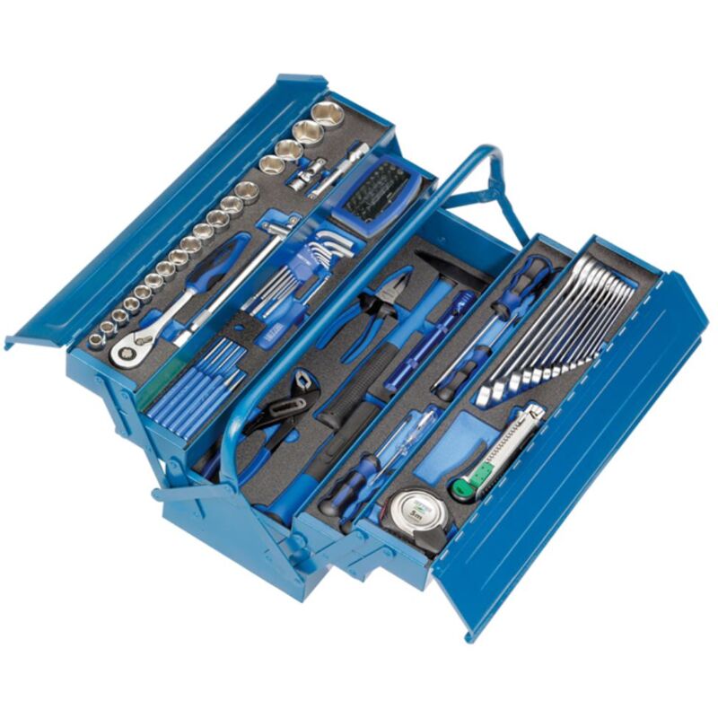• Cassetta portautensili in acciaio a 5 pezzi verniciata in Hammschlagblau • LID Bloccabile tramite serratura in ferro • Resort utensili industriali da 96 pezzi alloggiati in 5 moduli rigidi in schiuma • Scatola Dimensioni esterne 530x200x200 mm, completo Peso 14,5 kg.