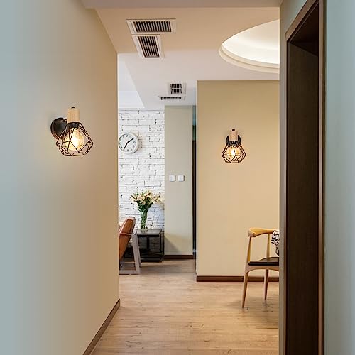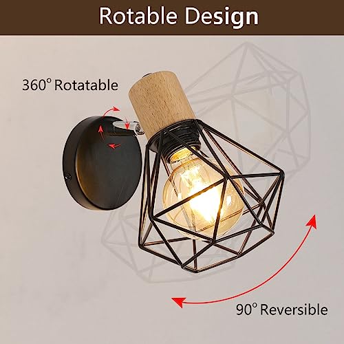 Toolight Lampada da Parete Industriale Vintage, Applique da Parete 360° Girevole in Legno, Lampada a Muro in Metallo con Gabbia Nera in Ferro E27 per Camera da Letto Corridoio Soggiorno, Max 60W