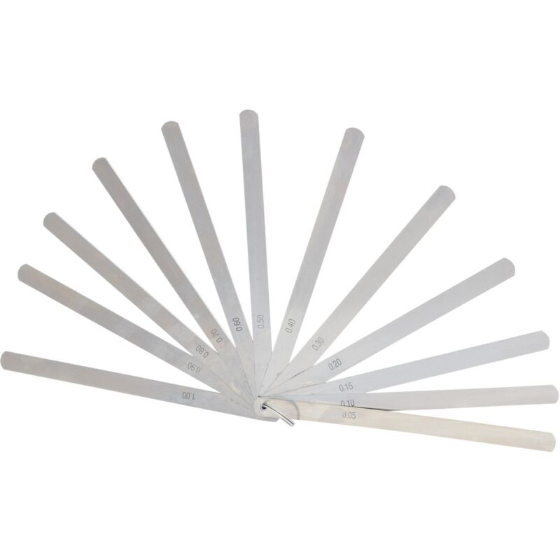 Per controllare spazi intermedi, distanze di contatto, ecc. Spessimetro cilindrico Lame a ventaglio sull'anello Lame con indicazione della misura Lame in acciaio per molle temprato