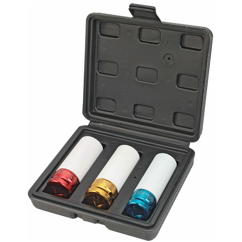 Cromo Molibdeno (altissima resistenza e longevità) Scatola composita. Innesto a 2 punti per prese da 1/2". Prese: 17 - 19 - 21 mm.